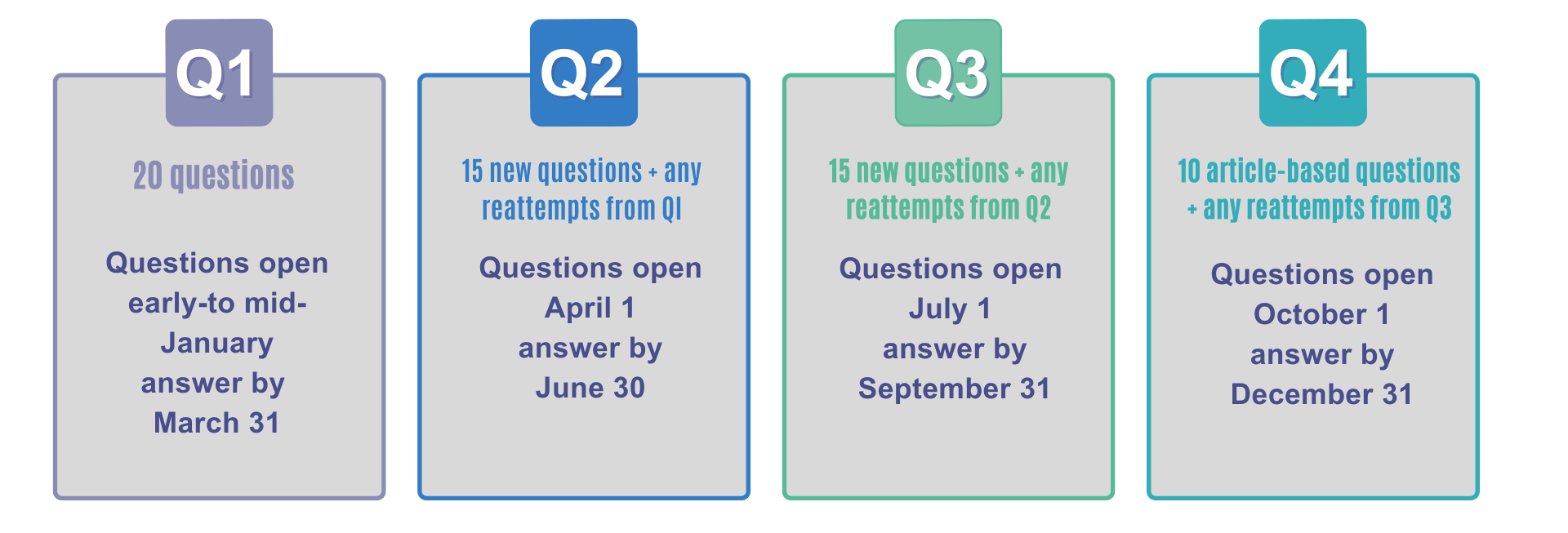 • Quarter 3: 15 new questions + any reattempts from Q2